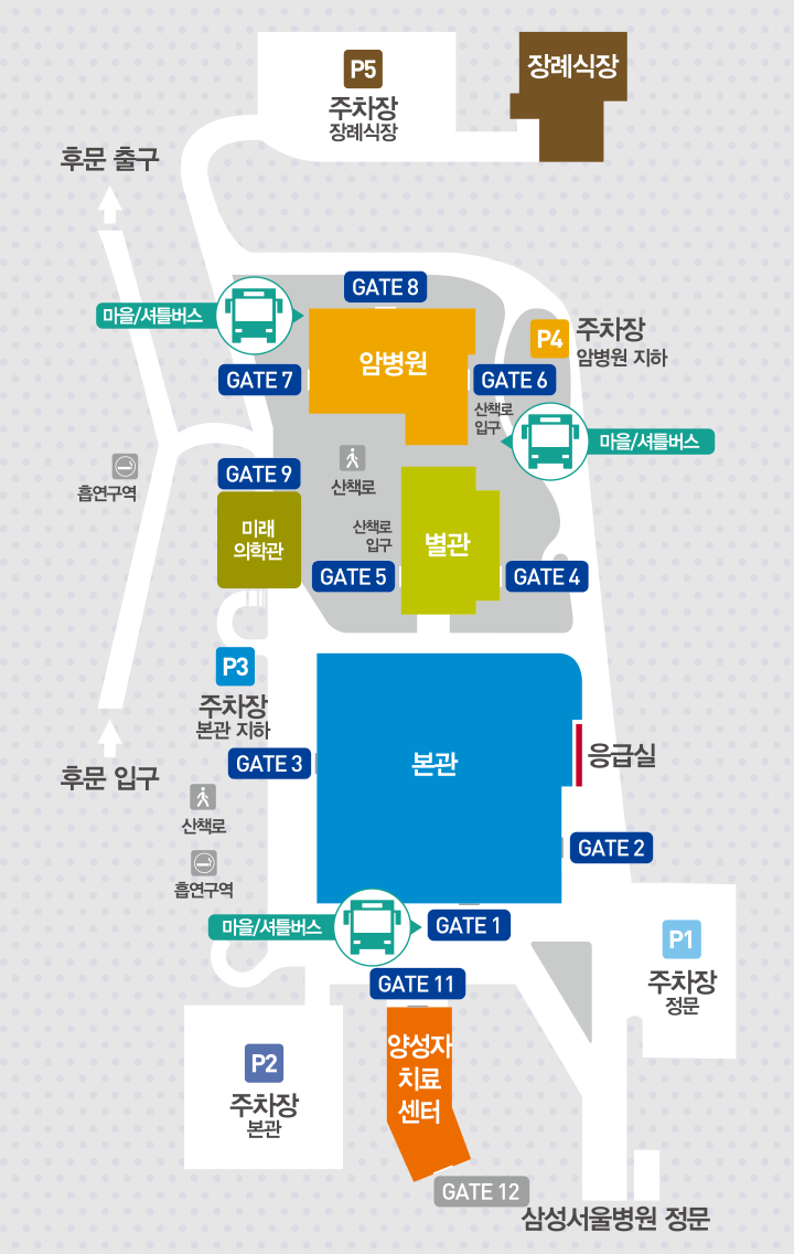 마지막은 버스입니다. 삼성서울병원에는 정문과 후문에 이르기까지 3개의 정류소가 있습니다. 각각의 정류소에 초록색 지선버스와 파란색 간선버스, 빨간색 광역버스가 정차하니 잘 구분해서 탑승하세요,