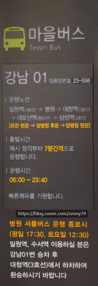 삼성서울병원 본관 정문 정류장에서는 마을버스도 함께 이용할 수 있습니다. 셔틀버스가 운행하지 않는 공휴일이나 저녁시간에는 마을버스를 이용해서 지하철 3호선(대청역)까지 이동하실 수 있습니다.