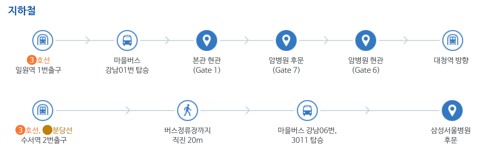 서울에 거주하시는 분들이라면 지하철을 이용하시는 것이 더 빠를 겁니다. 삼성서울병원은 3호선 일원역에서 가장 가깝습니다. 약 700m 정도 떨어져 있어 도보로 약 12~15분 정도 걸리는데, 걷기 불편하신 분들이라면 일원역 1번출구 앞에서 마을버스를 이용하실 수도 있습니다. 바로 다음역인 수서역에서도 버스를 이용해 삼성서울병원 후문까지 바로 올 수 있습니다.